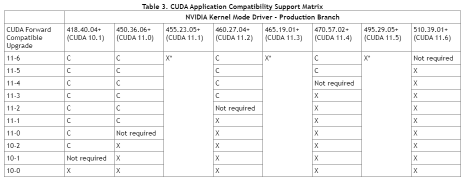 위에서 말한 GPU Driver의 하위 호환성에 따라 그래픽 드라이버를 510.47버전으로 설치 했다면 호환성 테이블에서 보이는 모든 CUDA의 버전을 이용 가능하게 되는 것이다. (Linux 기준)